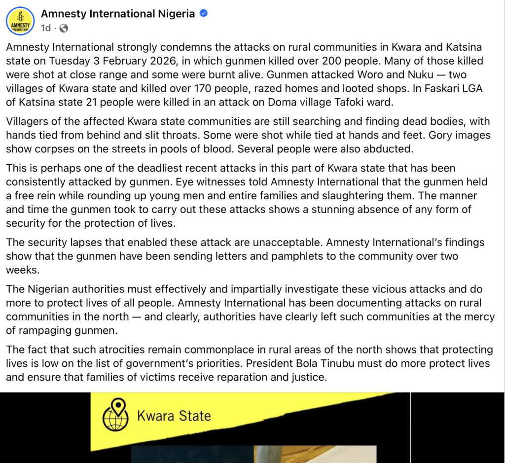 A large-scale mass casualty attack struck Nuku and Woro villages in Kwara State, Nigeria in February 03 2026. Armed militants, suspected to be affiliated with Boko Haram, reportedly stormed the predominantly Muslim villages in a coordinated night raid that lasted approximately three to four hours, killing ~75 people and ~38 abducted. Amnesty reports the number of people killed in the area could be ~170. Witnesses indicate that the attackers moved systematically through the settlements, setting homes and shops ablaze and killing residents in what appears to have been a deliberate campaign of intimidation and punishment.